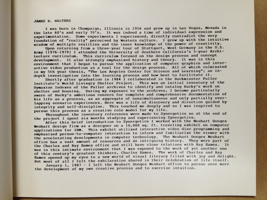 In 1984 I had the great privilege to spend eight weeks at the RBF Institute in Los Angeles working on the World Livingry Shelter Project. I was personally moved by Bucky's initiative and how much effort he devoted to documenting and preserving his 50 Year Experiment.
