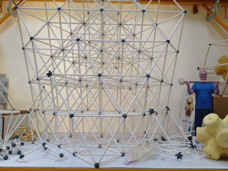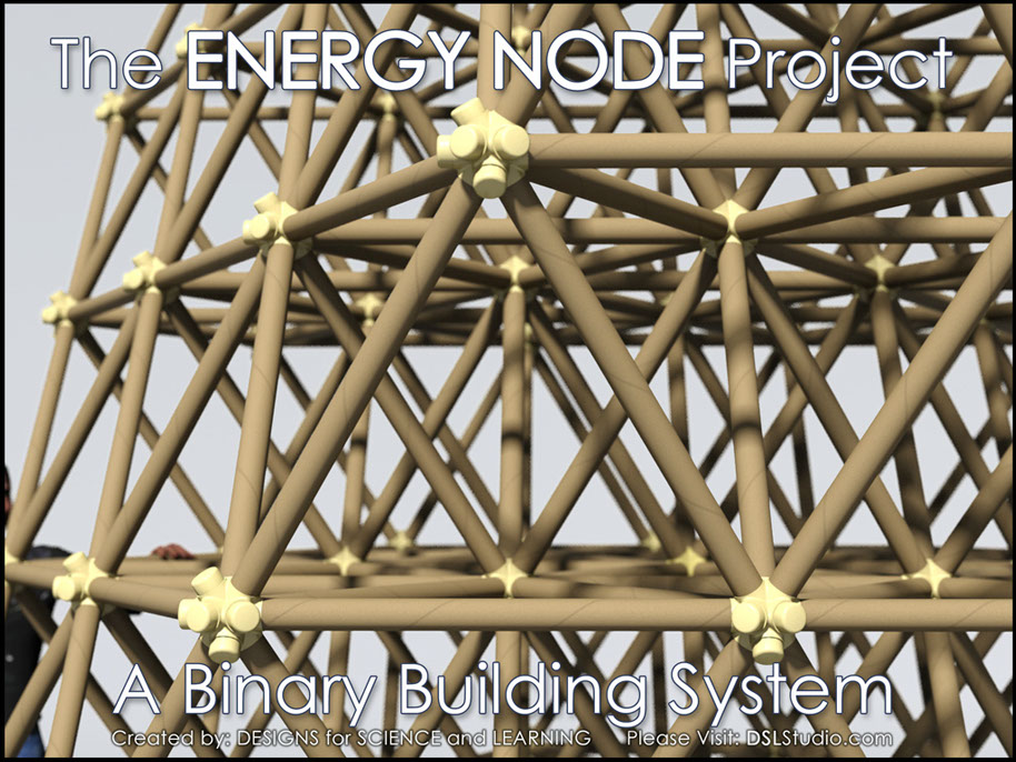 The ENERGY NODE, along with typical 2” diameter mailing tubes, becomes a SIZE INDEPENDENT building system. Explore the Isotropic Vector Matrix and create Octet Truss space frame structures.
