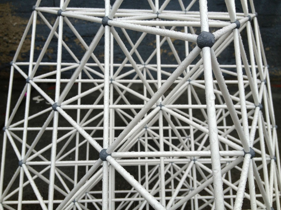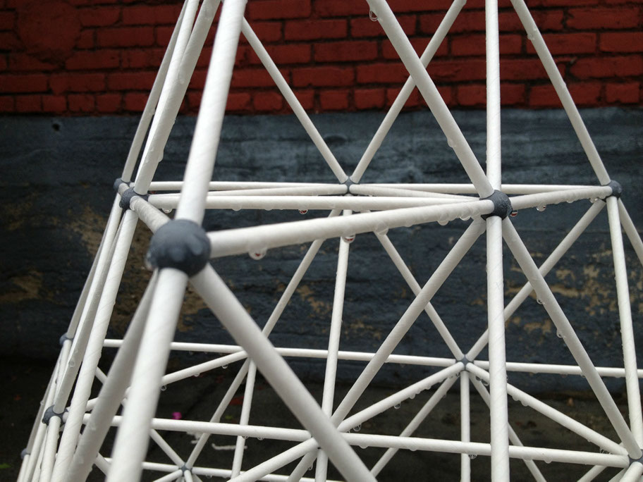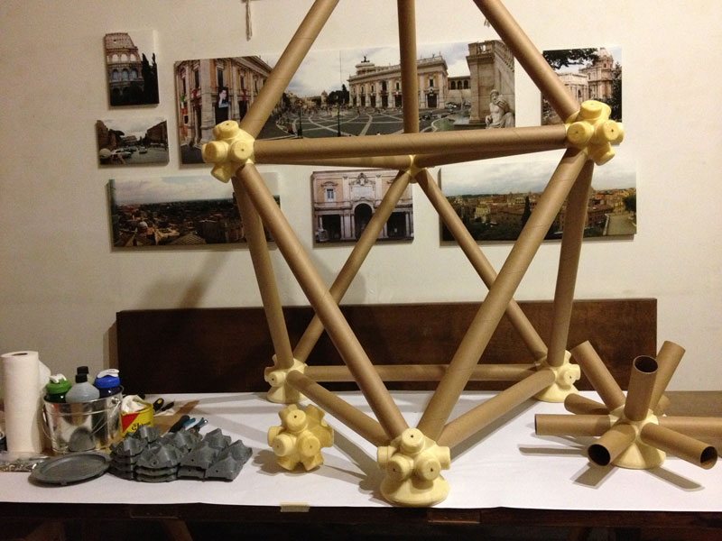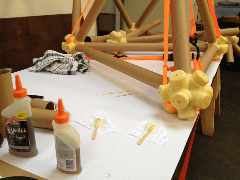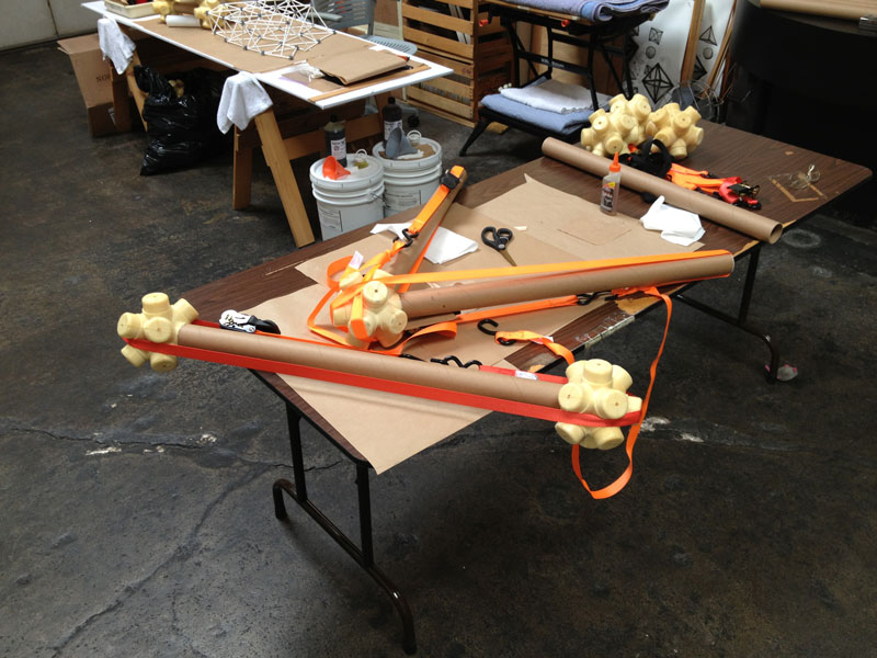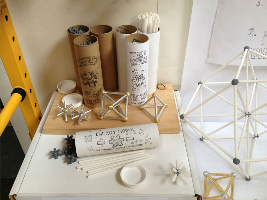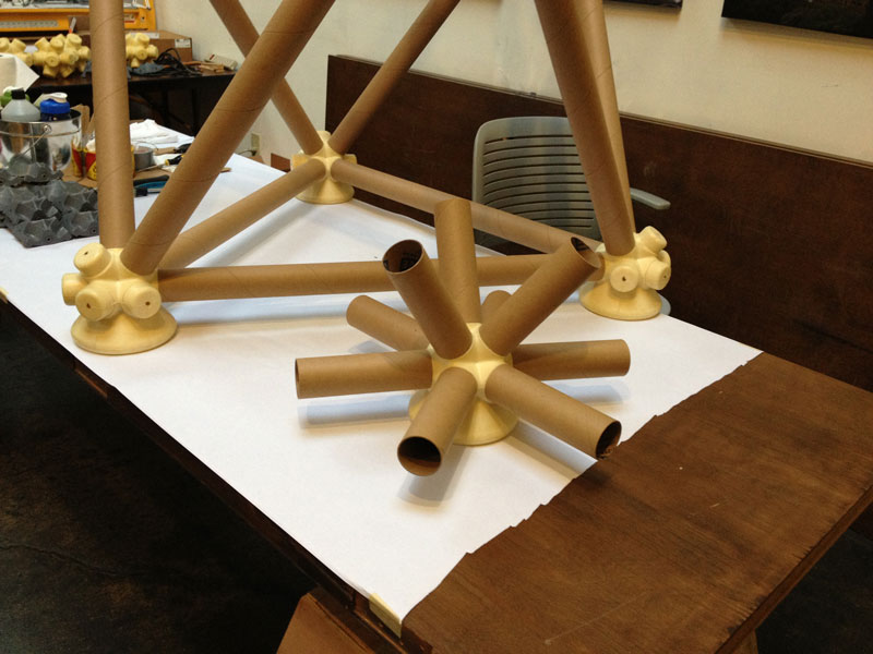 The vector is a typical 2” diameter kraft paper mailing tube. The node is a custom designed rigid polyurethane foam casting. Together the two become an all-space-filling, binary building system.