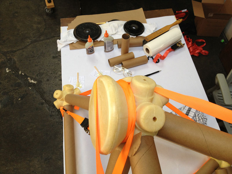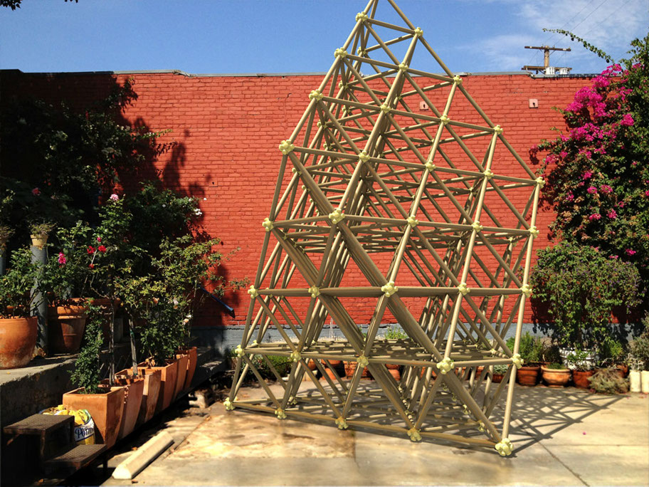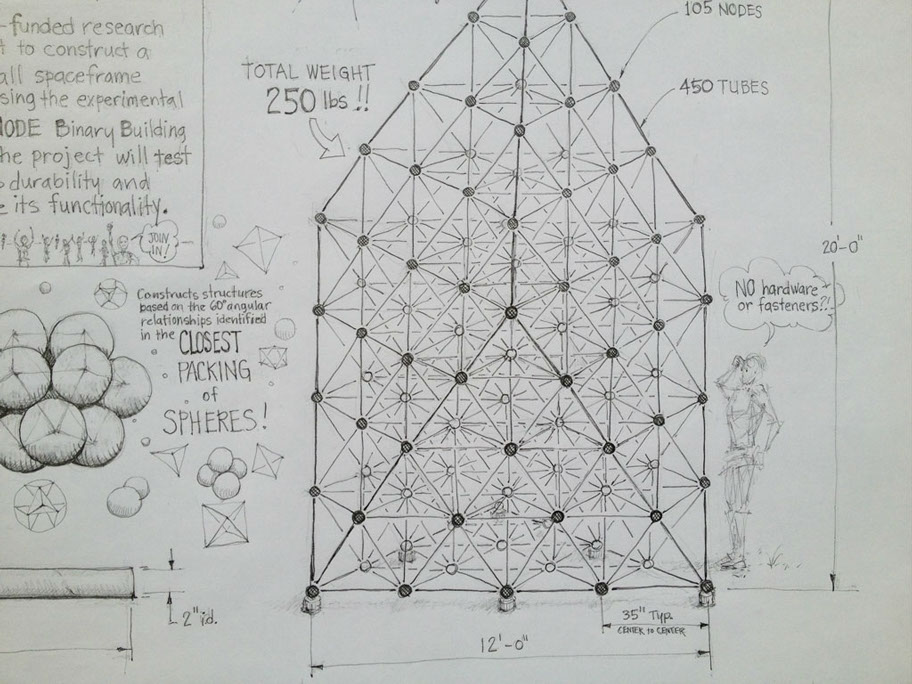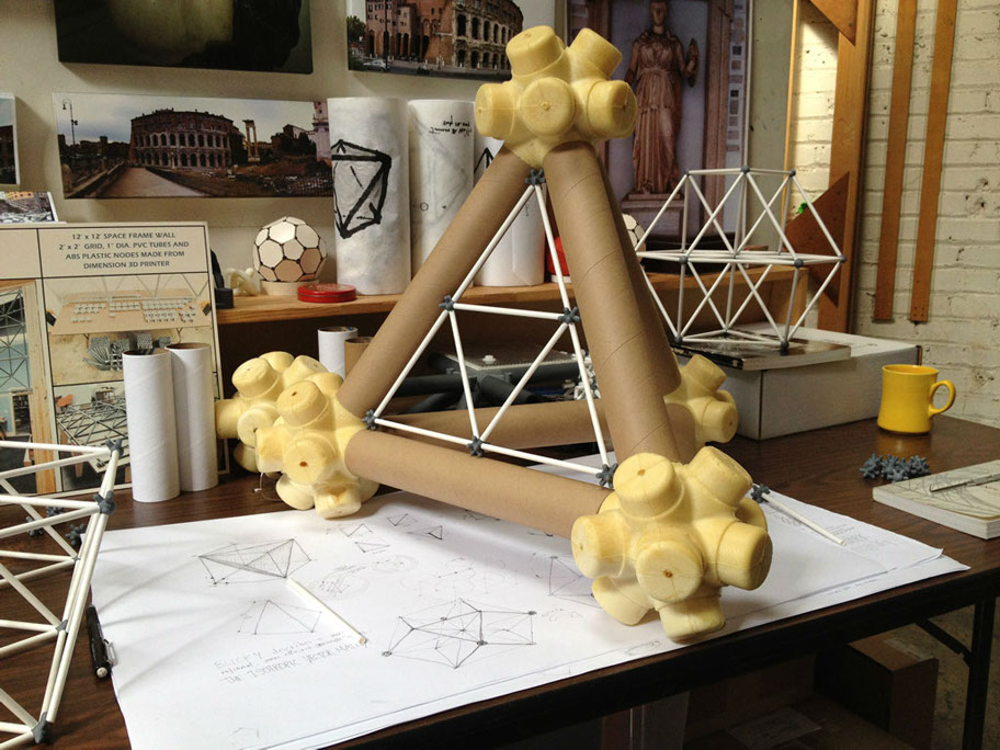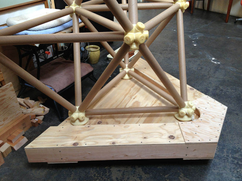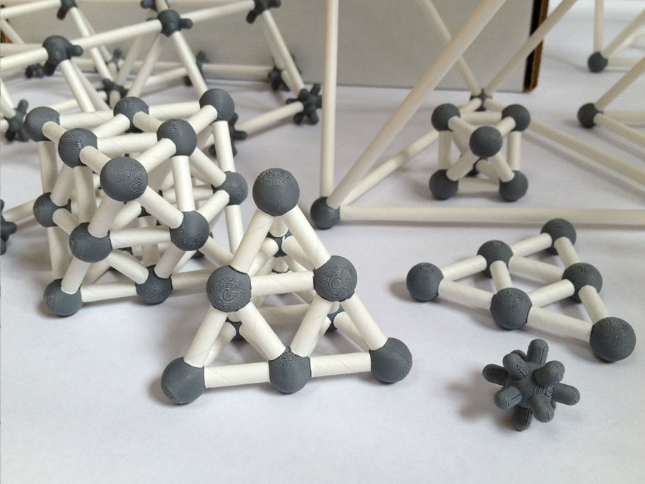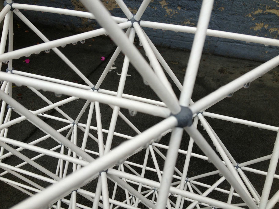 The vector is a typical 2” diameter kraft paper mailing tube. The node is a custom designed rigid polyurethane foam casting. Together the two become an all-space-filling, binary building system.
