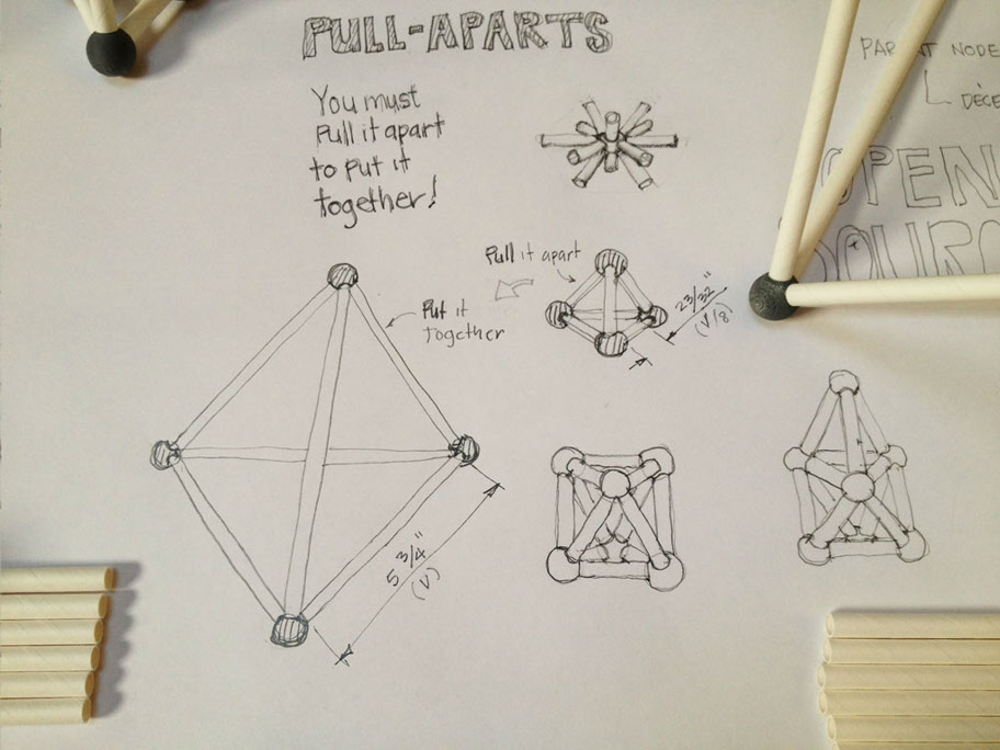 While playing around I came up with the idea making kits with the smaller polyhedra and longer straws. You pull it apart then put it together.