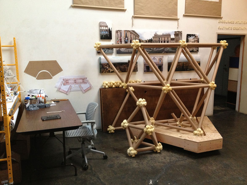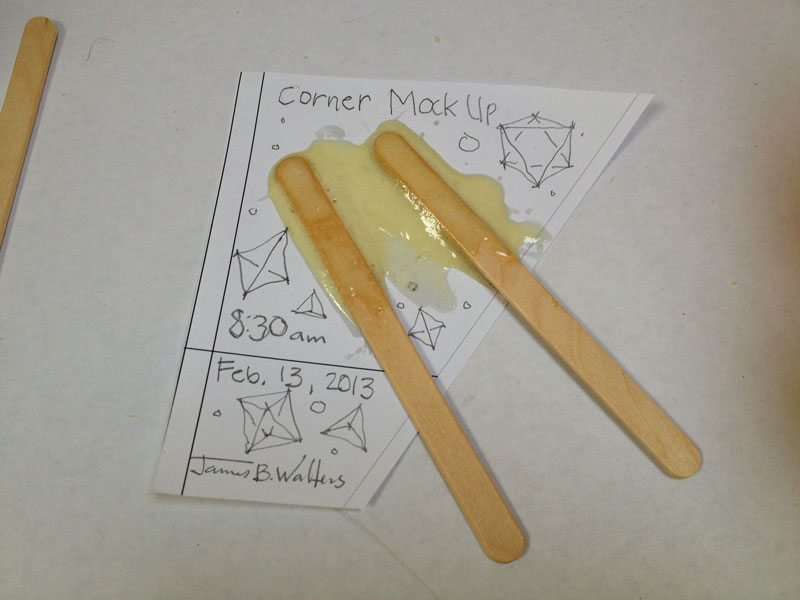 Once I finished casting the nodes, my attention was focused on the assembly sequence and methodology. The objective was to create a full scale corner mock-up to define and observe the process. This is a hands-on activity that engages all the senses... something computer work alone lacks. I also anticipated that this would NOT be a linear process and that documentation would be essential. These are a few summaries of significant scenarios...
