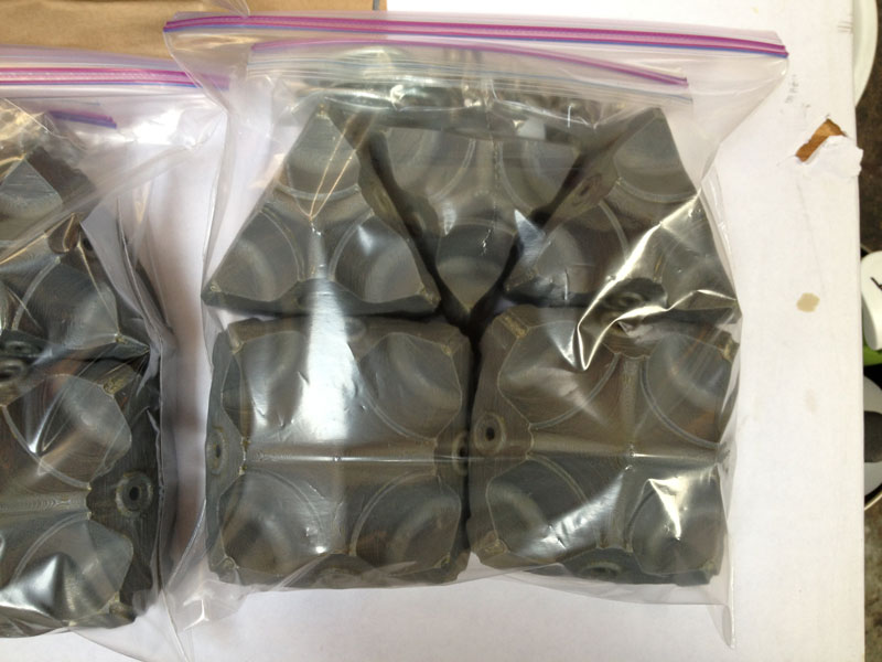 The mold parts were designed in SolidWorks, then fabricated using the Dimension 3D printer. The parts are ABS plastic and there are 6 square components and 8 triangular components.