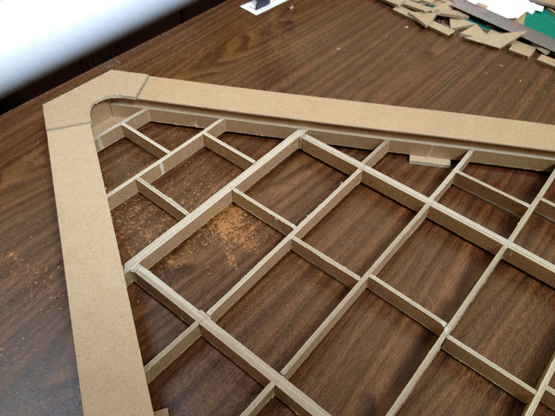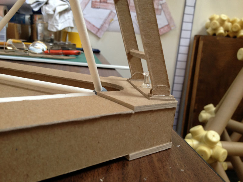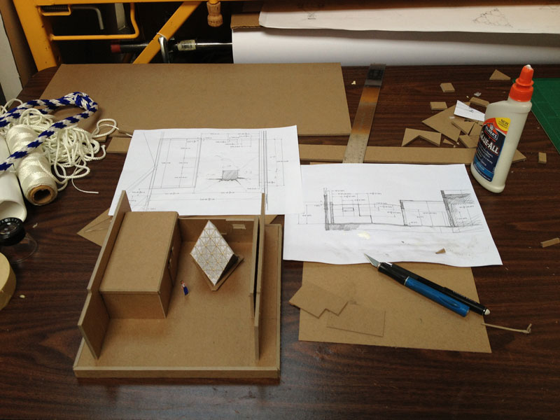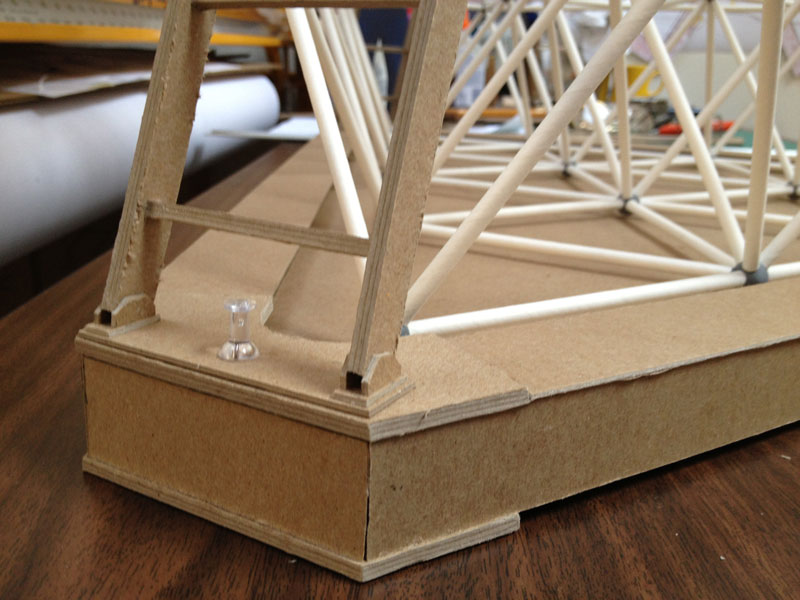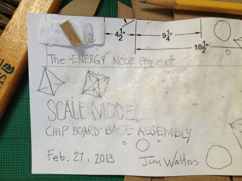Building the full-scale mock-up gave me a good idea what the corner detail was going to look like and how the box beam edges get locked into them during assembly. To get a better feel for the behavior of the base structure as a whole I constructed the scale model. The scale of the base model coincides with the paper straw scale model of The ENERGY NODE Project.