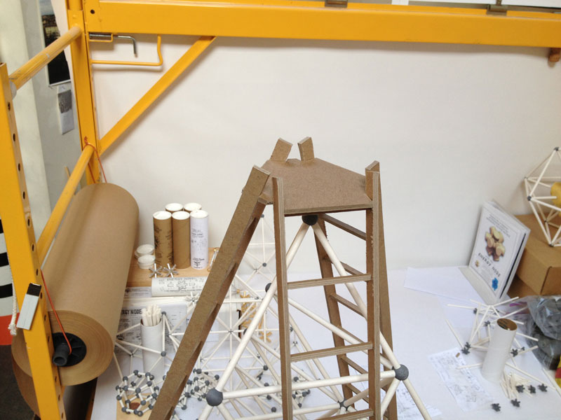 I had constructed a 1:10 scale model of the project made with 1/4” diameter paper drinking straws to determine the most efficient construction sequence for the 20’ tall structure made with 2” diameter kraft paper mailing tubes. So I brought the scale model out and sat it in the rain for five hours! Because the drinking straw and the mailing tubes are both paper products and are made with a similar spiral laminated construction I wanted to experience first hand how this structure would preform in the rain.